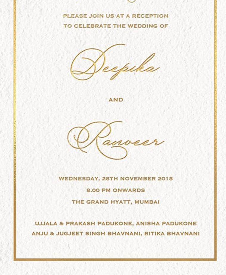 रिसेप्शन कार्ड अभिनेत्री मनीषा कोइराला ने अपने ट्विटर अकाउंट से शेयर किया है। कार्ड पर लिखा है- कृपया हमारी शादी का जश्न मनाने के लिए आप सभी पधारे। यह रिसेप्शन मुंबई स्थित ग्रैंड हयात में आयोजित किया जाएगा। साथ पार्टी का ड्रेस कोड ब्लैक टाई रखा गया है। 21 नवंबर को हुई दीपिका-रणवीर की रिस्पेशन पार्टी मे दोनों परिवारों के करीबी रिश्तेदार शरीक हुए। बैंगलोर स्थित दीपिका के घर को दुल्हन की तरह सजाया गया था। रिसेप्शन पार्टी की तस्वीरें सोशल मीडिया पर समाने आ चुकी हैं।