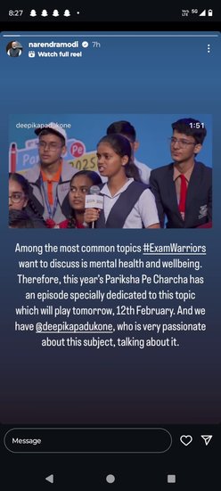 पीएम मोदी ने अपनी इंस्टाग्राम स्टोरी पर लिखा, “सबसे आम विषयों में से परीक्षा योद्धा जिस पर चर्चा करना चाहते हैं वह मानसिक स्वास्थ्य और खुशहाली है। इसलिए, इस वर्ष की परीक्षा पे चर्चा में विशेष रूप से इस विषय को समर्पित एक एपिसोड है जो कल, 12 फरवरी को चलेगा।”