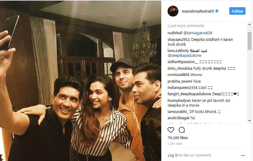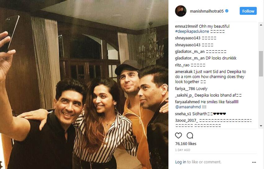बॉलीवुड डिजायनर मनीष ने अपने आधिकारिक इंस्टाग्राम अकाउंट से एक सेल्फी पोस्ट की जिसमें वो दीपिका, सिद्धार्थ और करण के साथ नजर आ रहे हैं। इसपर कई यूजर्स ने अपने विचार जाहिर किए। जहां बहुत सो लोगों को लगा कि दीपिका और सिड साथ में किसी फिल्म में नजर आने वाले हैं वहीं दूसरों ने कहा कि सेलिब्रिटीज ने बहुत ज्यादा पी रखी है। शयान 2911 नाम के यूजर ने लिखा- दीपिका, सिदाध्राथ और करण पीए हुए लग रहे हैं। डोलू चौबीसा ने लिखा- दिपिका पूरी तरह से नशे में चूर हैं। आई एम सुरभि ने लिखा- दीपिका भांड लग रही हैं।