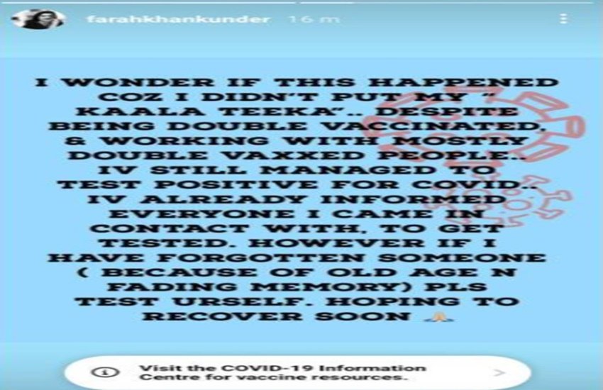 बॉलीवुड फिल्ममेकर कोरियोग्राफर फराह खान पूर्णतः वैक्सिनेटेड होने के बावजूद भी कोविड़ संक्रमण का शिकार हो गईं हैं। उन्होंने कोरोनावायरस से संक्रमित होने की जानकारी देते हुए कहा है कि उन्होंने वैक्सीन की दोनों डोज ली थी। उन्होंने बताया कि वो उन्हीं लोगों के साथ काम कर रहीं थीं जो वैक्सीन की दोनों डोज ली चुके हैं, बावजूद उसके उन्हें संक्रमण हो गया है।