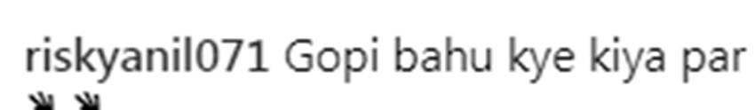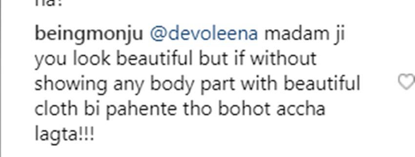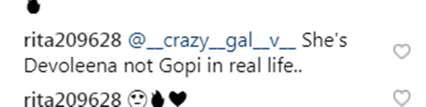 एक यूजर ने लिखा- गोपी बहू के संस्कार देखो, यह सब क्या है गोपी बहू। वहीं एक अन्य यूजर ने लिखा- गोपी बहू यह क्या किया। जबकि एक यूजर ने लिखा कि आप सुंदर दिख रही हैं, लेकिन बिना बॉडी को दिखाए भी आप अच्छी लग सकती हैं। देवोलिना की पोस्ट पर कुछ फैन्स ने उनका बचाव भी किया है। एक फैन ने लिखा कि वह रियल लाइफ में देवोलिना है, गोपी बहू नहीं। कई लोगों ने देवोलिना के बदले लुक की तारीफ की है।