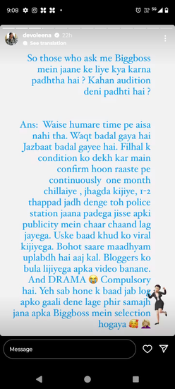 देवोलीना ने इंस्टाग्राम स्टोरी पर लिखा, “तो जो लोग मुझसे पूछते हैं बिग बॉस में जाने के लिए क्या करना पड़ता है? कहां ऑडिशन देनी पड़ती है? जवाब: वैसे हमारे टाइम पर ऐसा नहीं था, वक्त बदल गया है जज्बात बदल गए हैं। फिलहाल के कंडीशन को देखकर मैं कंफर्म हूं रास्ते पर लगातार एक महीने चिल्लाइए, झगड़ा कीजिए, 1-2 थप्पड़ जड़ देंगे तो पुलिस स्टेशन जाना पड़ेगा जिससे आपकी पब्लिसिटी में चार चांद लग जाएगा। उसके बाद खुद को वायरल कीजिएगा, बहुत सारे माध्यम उपलब्ध हैं आजकल। व्लॉगर्स बुला लीजिएगा आपका वीडियो बनाने के लिए और ड्रामा जरूरी है। ये सब करने के बाद जब लोग आपको गाली देने लगें तो समझ लीजिए आपका बिग बॉस में सेलेक्शन हो गया।”