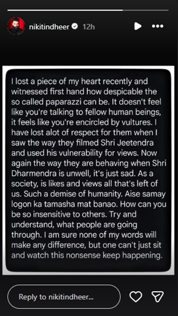 इसके बाद करण जौहर और अमीषा पटेल ने पैपराजी के खिलाफ नाराजगी जाहिर की। अब दिवंगत अभिनेता पंकज धीर के बेटे एक्टर निकितिन धीर ने एक नोट शेयर करते हुए पैपराजी की आलोचना की और उनकी तुलना “गिद्धों” से की। उन्होंने इंस्टाग्राम स्टोरीज पर लिखा, “मैंने हाल ही में अपने दिल का एक टुकड़ा खो दिया और खुद देखा कि तथाकथित पैपराजी कितने घिनौने हो सकते हैं। ऐसा नहीं लगता कि आप किसी इंसान से बात कर रहे हैं, बल्कि ऐसा लगता है जैसे आप गिद्धों से घिरे हुए हैं। जब मैंने देखा कि उन्होंने जीतेंद्र जी को किस तरह शूट किया और उनकी कमजोरी का इस्तेमाल व्यूज के लिए किया, तो मेरे मन में उनके लिए बहुत सम्मान कम हो गया।”