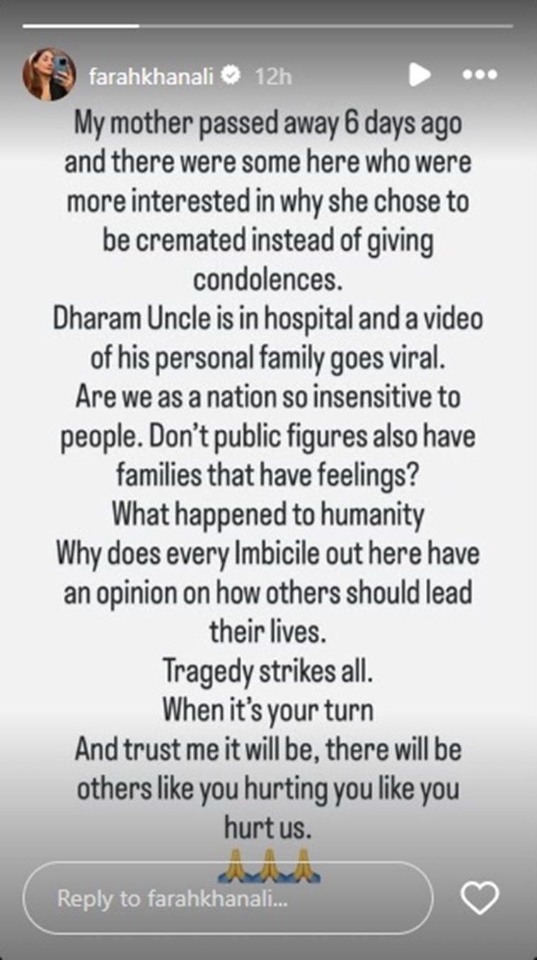 फराह खान अली, जिनकी मां जरीन खान का कुछ दिन पहले निधन हो गया था, उन्होंने भी निजता के हनन की आलोचना की। उन्होंने सोशल मीडिया पर लिखा, “मेरी मां का 6 दिन पहले निधन हो गया, और यहां कुछ लोग शोक व्यक्त करने के बजाय इस बात में ज्यादा रुचि ले रहे थे कि उन्होंने अंतिम संस्कार क्यों चुना। धर्म अंकल अस्पताल में हैं और उनके निजी परिवार का एक वीडियो वायरल हो रहा है। क्या हम एक राष्ट्र के रूप में लोगों के प्रति इतने असंवेदनशील हैं? क्या पब्लिक फिगर के परिवार नहीं होते जिनकी भावनाएं होती हैं? मानवता को क्या हो गया है? यहां हर मूर्ख की अपनी राय क्यों है कि दूसरों को कैसे जीना चाहिए। बुरा वक्त सभी पर आता है। जब आपकी बारी आएगी, और यकीन मानिए, आएगी, तो आपके जैसे और लोग भी आपको उसी तरह चोट पहुंचाएंगे जैसे आपने हमें पहुंचाई है।”