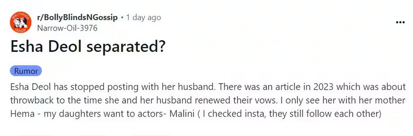 दरअसल, बॉलीवुड लाइफ और बॉलीवुड शादी डॉटकॉम में छपी एक खबर के अनुसार ये बातें तब सामने आई जब हाल ही में एक सोशल मीडिया यूजर ने रेडिट पर एक पोस्ट शेयर की। यूजर ने दावा किया कि ईशा देओल ने अपने पति के साथ तस्वीर शेयर करनी बंद कर दी हैं। उनकी आखिरी फोटो 30 जून 2023 की है। ईशा देओल अधिकतर मौकों पर अपनी मां हेमा मालिनी के साथ नजर आती हैं।