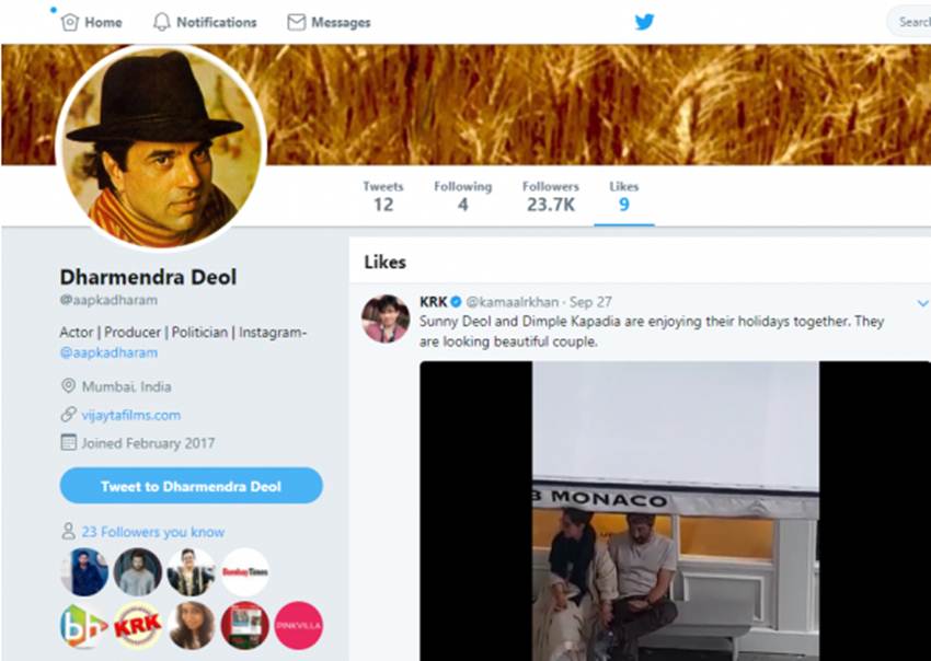 सभी लोगों को पता होगा कि सनी देओल और डिंपल कपाड़िया की एक वीडियो सोशल मीडिया पर काफी वायरल हुई थी। इस वीडियो में दोनों लंदन की किसी जगह पर हाथों में हाथ लिए एक बेंच पर बैठे हुए नजर आ रहे थे। जिस चीज ने सबसे ज्यादा हैरान किया वो है एक्टर के पिता और बॉलीवुड के वरिष्ठ एक्टर धर्मेंद्र द्वारा इस वीडियो को लाइक करना। जी हां आपने सही पढ़ा। पिंकविला की एक रिपोर्ट के अनुसार धर्मेंद्र जिन्होंने हाल ही में टेविटर पर डेब्यू किया है उन्होंने वीडियो को लाइक किया था। कमाल आर खान ने अपने ट्विटर पर डिंपल और सनी का एक वीडियो शेयर करते हुए लिखा था- सनी देओल और डिंपल कपाड़िया साथ में अपने हॉलीडे को एंज्यॉय कर रहे हैं। दोनों साथ में एक खूबसूरत कपल लग रहे हैं।