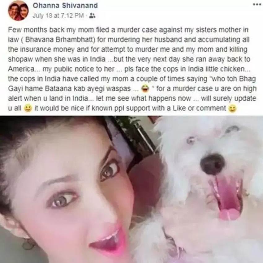 शिल्पा ने आरोप लगाया है कि उनकी बहन की सास के खिलाफ कुछ ऐसे सबूत हाथ लगे हैं। जिनसे पता चलता है कि उन्होंने इंश्योरेंस के पैसों के लिए पति का मर्डर करा दिया। शिल्पा का कहना है कि जब उन्होंने इस बात की जानकारी पुलिस को दी तो उन दोनों ने उन्हें मारने की साजिश रची। शिल्पा ने फेसबुक पोस्ट पर लिखा- ”मेरी बहन की सास, मुझे और मेरी मां को मारने की फिराक में है। जब मेरी बहन साक्षी इंडिया आई तो उसे भी मारने की कोशिश की। जब मामले की जानकारी पुलिस को दी तो वह अमेरिका भाग गई। मैं अपनी बहन की सास से कहना चाहती हूं कि यदि हिम्मत है तो भारत वापस आए और कानून का सामना करे।”