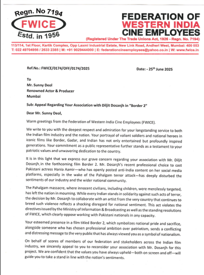 “FWICE आपकी अपकमिंग फिल्म बॉर्डर 2 में दिलजीत दोसांझ की कास्टिंग को लेकर बेहद निराश और चिंतित है। दिलजीत ने बड़ी ही बेशर्मी से देश में चल रही संवेदनशील स्थिति की अनदेखी की है। FWICE पहले ही स्पष्ट कर चुका है कि पाकिस्तानी आर्टिस्ट्स के साथ किसी भी तरह का सहयोग या कोलैबोरेशन स्वीकार नहीं किया जाएगा।”