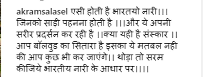 दिशा की पोस्ट के कमेंट बॉक्स में एक यूजर ने लिखा- ऐसी होती हैं भारतीय नारी? जिनको साड़ी पहननी होती है। ये अपना शरीर प्रदर्शन कर रही हैं। क्या यही संस्कार हैं? आप बॉलीवुड स्टार हैं इसका मतलब ये नहीं है कि आप कुछ भी करेंगी। थोड़ी तो शर्म कर लो। वहीं एक अन्य यूजर लिखता है- इतनी बेशर्मी क्यों? एक अन्य फॉलोवर ने लिखा- शर्म कर लो भइया।