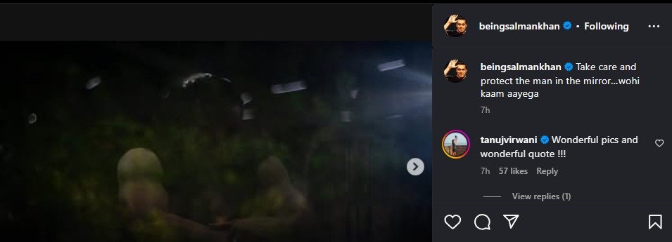 सलमान खान ने अपनी तस्वीर शेयर करते हुए लिखा है- ”अपना ख्याल रखो, जो मिरर में दिखता है उसे बचाकर रखो… वही काम आएगा।”