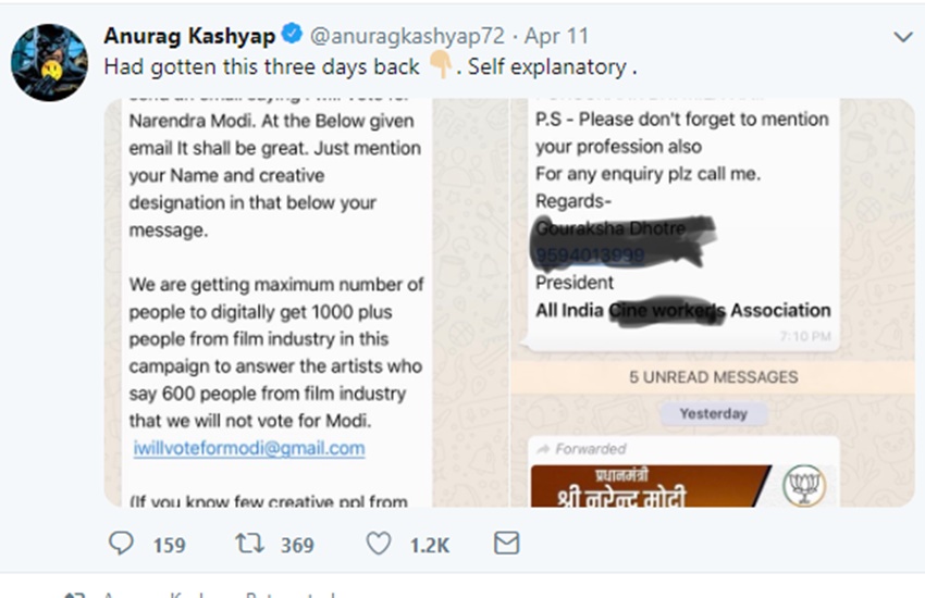 इस अभियान में शामिल होने के लिए फिल्म उद्योग से जुड़े 1000 से अधिक लोगों को संदेश मिला है। ये संदेश उन लोगों को मिला है जो मोदी को वोट नहीं देने की बात कहते हैं। साथ ही लिखा है कि, ‘अगर फिल्म उद्योग से जुड़े लोगों को जानते हैं जो मोदी के अनुयायी हैं, कृपया उन्हें इस संदेश को प्रेषित करें।’ अनुराग ने बताया कि, ‘यह संदेश महाराष्ट्र नवनिर्माण सिनेमा एसोसिएशन (एमएनसीए) के कार्यकर्ताओं में से एक धोत्रे ने भेजा था।’