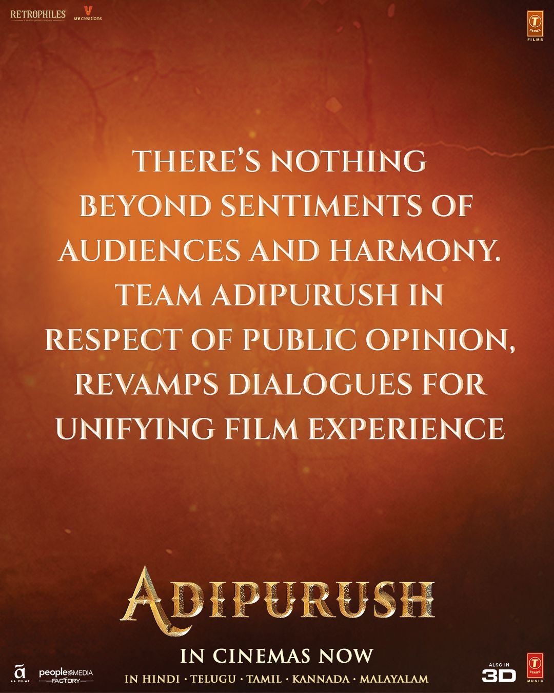 फिल्म 'आदिपुरुष' के डायलॉग्स पर विवाद थमने का नाम नहीं ले रहा है। इसे देखते हुए मेकर्स ने फैसला किया है कि वो इसके डायलॉग्स को फिर से लिखेंगे।
