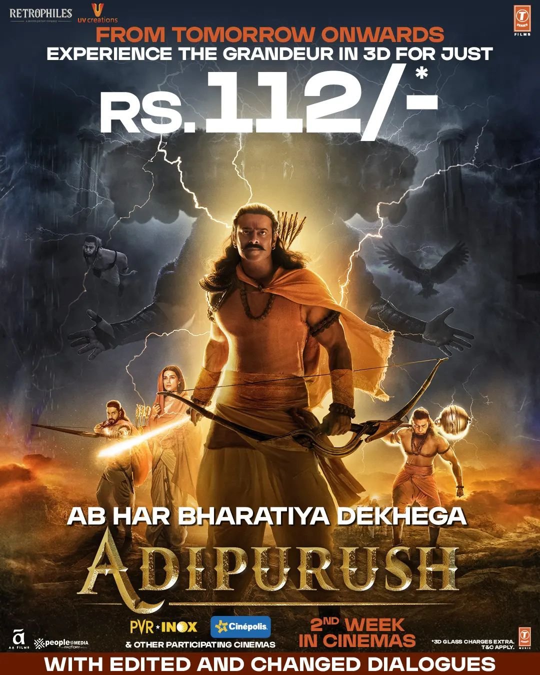 प्रभास की फिल्म 'आदिपुरुष' के टिकट प्राइस को एक बार फिर से कम किया गया है। फिल्म का पोस्टर जारी करते हुए जानकारी दी गई है कि इसके टिकट 112 रुपए में खरीद सकते हैं और फैमिली के साथ फिल्म का आनंद ले सकते हैं।