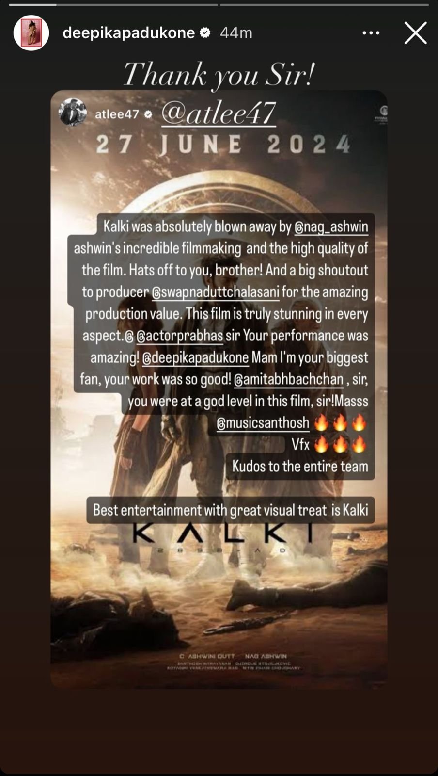 प्रभास और दीपिका पादुकोण स्टारर साइंस फिक्शन थ्रिलर फिल्म ‘कल्कि 2898 AD’ लोगों को पसंद आ रही है। ऐसे में, दीपिका पादुकोण की परफॉर्मेंस ने उनकी फिल्म जवान के डायरेक्टर एटली का भी दिल जीत लिया है। पोस्ट करके उन्होंने दीपिका की तारीफ की है।