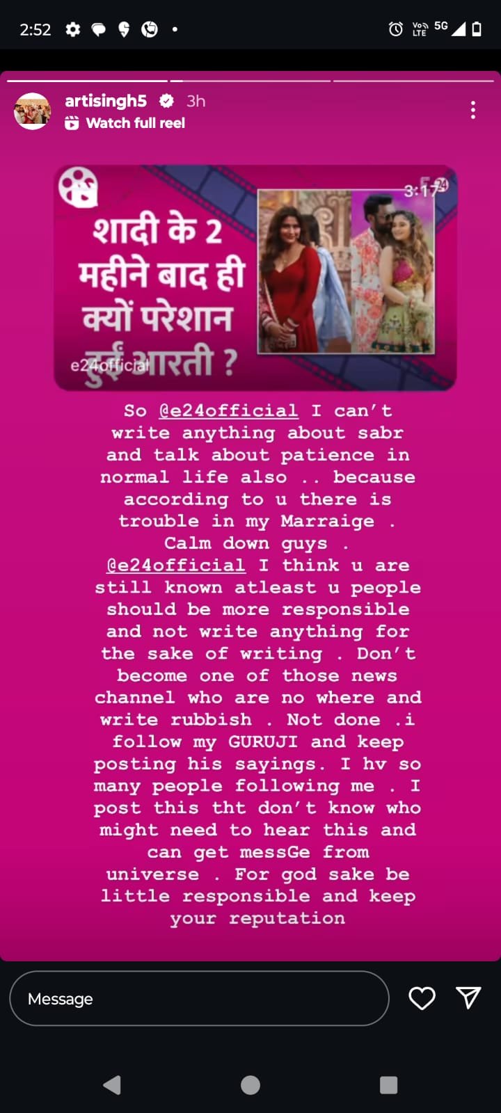 आरती सिंह के एक पोस्ट को लेकर कहा जा रहा था कि वह अपनी शादी से खुश नहीं हैं। इसपर आरती को काफी गुस्सा आया और उन्होंने इंस्टाग्राम पर ऐसा बोलने वालों को मुंह तोड़ जवाब दिया है।