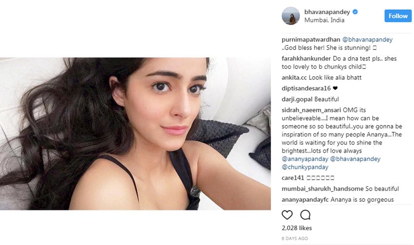 बॉलीवुड में सबसे ज्यादा चर्टित स्टार किड्स में एक नाम चंकी पांडे की बेटी अनन्या पांडे का भी है। कई रिपोर्ट्स में कहा जाता है कि सलमान खान से लेकर करण जौहर तक उन्हें फिल्म इंडस्ट्री मे लॉन्च करने की इच्छा रखते हैं। इस बार किसी और डायरेक्टर की नजर उनपर पड़ी है लेकिन किसी फिल्म के लिए नहीं। इस बार वजह कुछ और ही है। जब अनन्या की मां भावना पांडे ने बेटी की एक तस्वीर इंस्टाग्राम पर अपलोड की तो इसपर सबसे पहले मैं हूं ना कि डायरेक्टर फराह खान ने कमेंट किया। जिसके बाद सभी की नजरें उनके कमेंट पर आकर ठहर गईं।