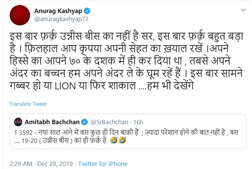 अनुराग कश्यप ने अमिताभ के इस ट्टीट पर निशाना साधते हुए लिखा है कि इस बार फर्क उन्नीस बीस का नहीं है सर, इस बार फर्क बहुत बड़ा है । फिलहाल आप कृपया अपनी सेहत का ध्यान रखें । अपने हिस्से का आपने 70 के दशक में ही कर दिया था, तबसे अपने अंदर का बच्चन हम अपने अंदर लेकर घूम रहें हैं । इस बार सामने गब्बर हो या LION या फिर शाकाल ….हम भी देखेंगे।