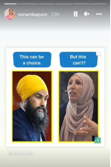 सोनम ने सोशल मीडिया पर एक तस्वीर शेयर की है, जिसमें एक तरफ पगड़ी पहने हुए एक सिख है और दूसरी तरफ बुर्का पहनी हुई एक महिला। सोनम ने तस्वीर के साथ सवाल पूछा, ”अगर पगड़ी एक विकल्प हो सकता है तो बुर्का क्यों नहीं? ”