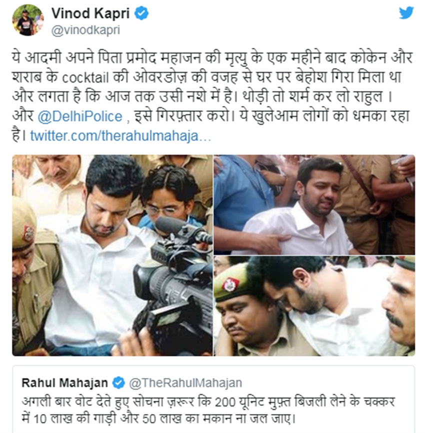 विनोद कापड़ी इन तस्वीरों को शेयर करते हुए कहते हैं-‘ ये आदमी अपने पिता प्रमोद महाजन की मृत्यु के एक महीने बाद कोकेन और शराब के कॉकटेल की ओवरडोज की वजह से घर पर बेहोश गिरा मिला था। ..और लगता है कि आज तक उसी नशे में है। थोड़ी तो शर्म करलो राहुल। दिल्ली पुलिस इसे गिरफ्तार करो। ये खुलेआम लोगों को धमका रहा है।’
