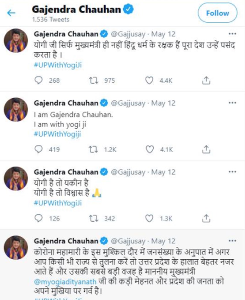 दूसरे ट्वीट में उन्होंने लिखा, ‘योगी जी को पूरा देश पसंद करता है। मैं गजेंद्र चौहान हूं और मैं योगी जी के साथ हूं।’ एक अन्य ट्वीट में चौहान ने लिखा, ‘योगी हैं तो यकीन है, योगी हैं तो विश्वास है।’ गजेंद्र चौहान ने एक और पोस्ट में लिखा कि यूपी सीएम योगी आदित्यनाथ हिंदू धर्म के रक्षक हैं…पूरा देश उन्हें पसंद करता है।
