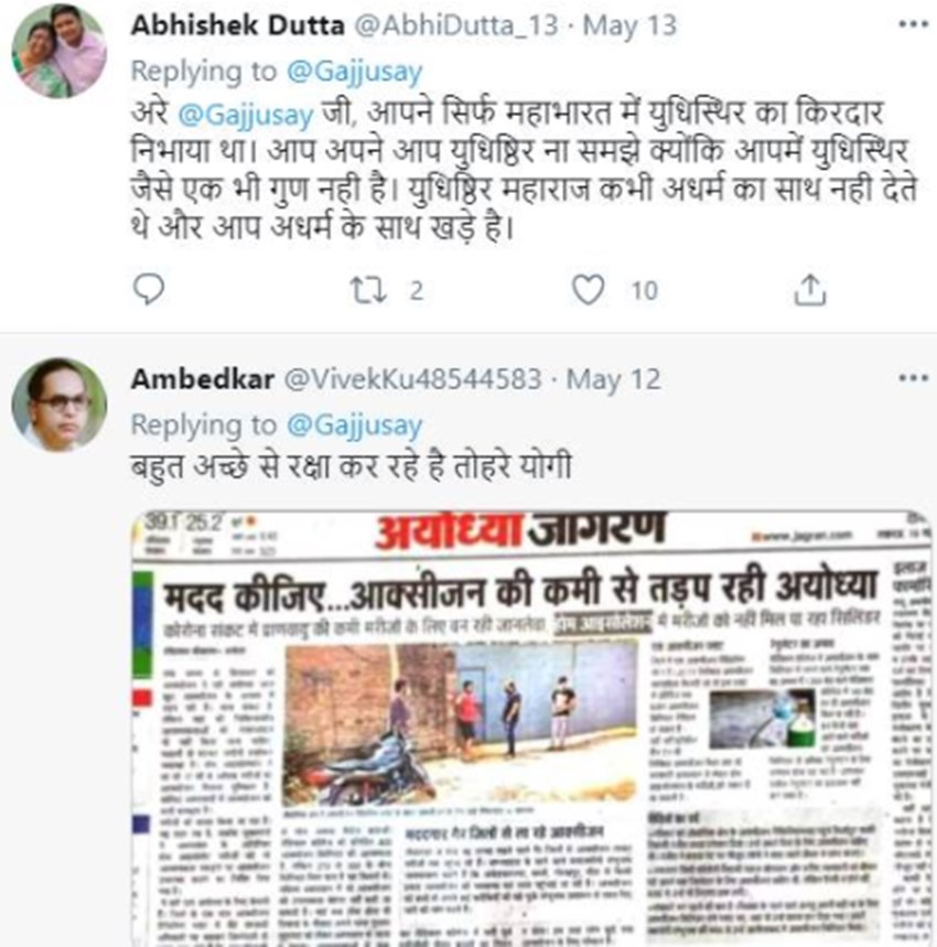 अभिषेत दत्त ने लिखा- ‘अरे सर आपने सिर्फ महाभारत में युधिष्ठिर का किरदार निभाया था। आप अपने आपको युधिष्ठिर ना समझें, क्योंकि आपमें युधिष्ठिर जैसे एक भी गुण नहीं है। युधिष्ठिर महाराज कभी अधर्म का साथ नहीं देते थे और आप अधर्म के साथ खड़े हैं।’ अंबेडकर नाम के यूजर ने ऑक्सीजन की कमी से जुड़ी खबर साझा करते हुए तंज किया- ‘बहुत अच्छे से रक्षा कर रहे है तोहरे योगी जी…।’ राजन कुमार यादव बोले- ‘ये हिन्दू के रक्षक नहीं भक्षक हैं।’ कुंदन किशोर ने पूछा- ‘अगर रक्षक ऐसा होता है तो भक्षक कैसा होता है?