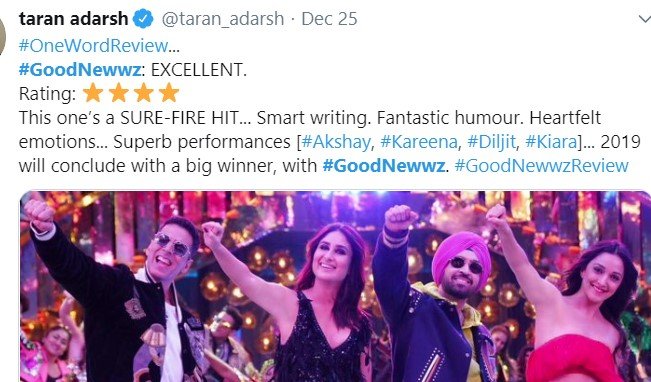 तरण आदर्श ने अक्षय कुमार की फिल्म गुड न्यूज को एक्सिलेंट बताया है। साथ ही फिल्म को 4 स्टार्स दिए गए हैं