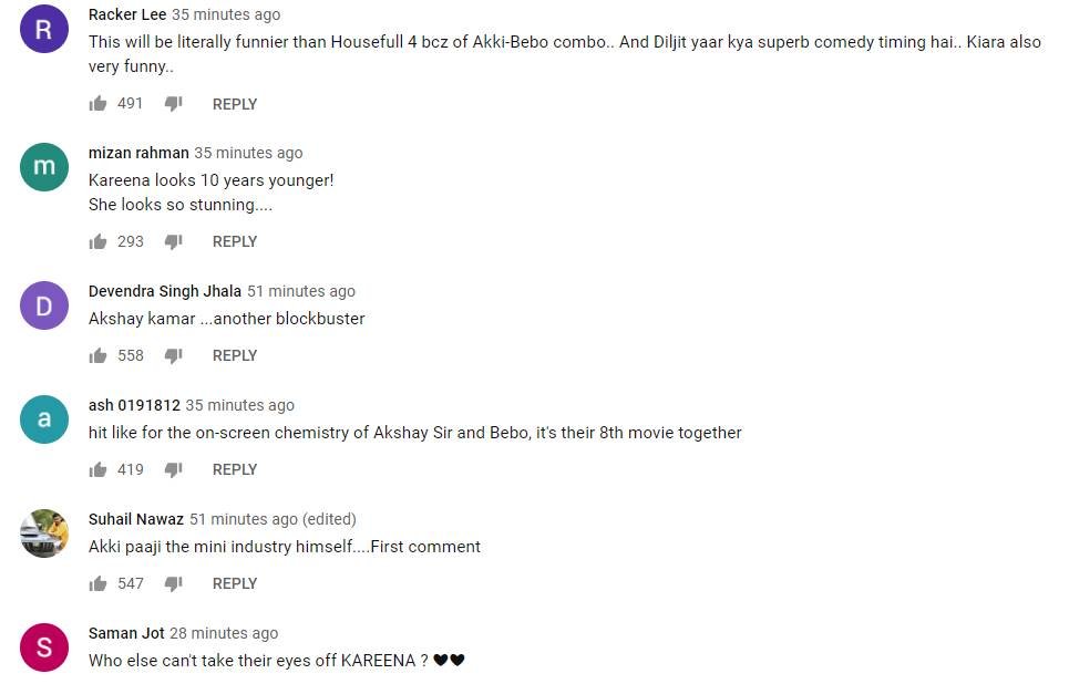इस फिल्म का ट्रेलर जो कोई भी देख रहा है पेट पकड़ कर हंस रहा है। देखें फैंस क्या क्या कह रहे हैं- हाउसफुल 4 सेस बहुत ज्यादा फनी फिल्म है। दिलजीत दोसांझ ने कमाल कर दिया क्या कॉमेडी टाइमिंग है। कियारा भी फनी लग रही है। तो किसी ने लिखा - करीना ट्रेलर में 10 साल और छोटी लग रही है।