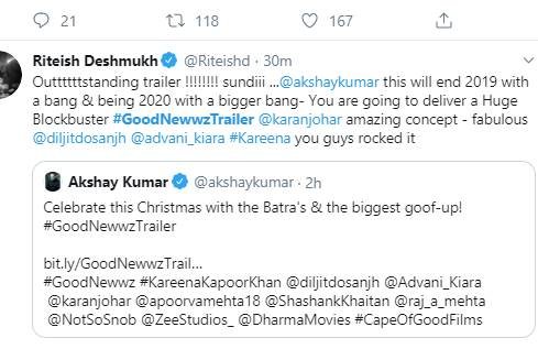 अब फिल्म के ट्रेलर को सेलेब्स की भी प्रतिक्रिया मिल रही है। रितेश देशमुख ने अक्षय कुमार की फिल्म गुड न्यूज को लेकर कमेंट किया है