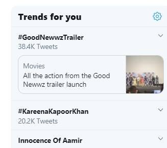 फिल्म गुड न्यूज के ट्रेलर को इतना पसंद किया जा रहा है कि अभी तक इस ट्रेलर को लेकर 38.4K ट्वीट्स किए जा चुके हैं।