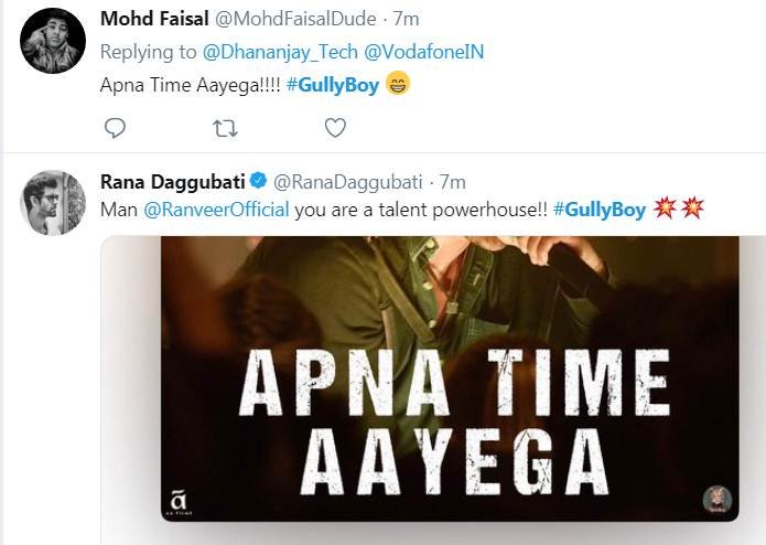 गली बॉय को देखने के बाद लोग फिल्म के एक गाने के बोल- 'अपना टाइम आएगा' को शेयर कर रहे हैं। बाहुबली एक्टर राणा दग्गुबाती ने भी सोशल मीडिया पर लिखा है कि अपना टाइम आएगा। कहा जा रहा है कि फिल्म को वीकेंड का भी खूब फायदा मिलेगा और जमकर कमाई करने में सफल रहेगी।