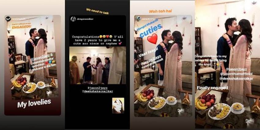 ‘हैप्पी फिर भाग जाएगी’ एक्टर जेसन थॉम ने बीते 22 अगस्त को अपनी गर्लफ्रेंड दीक्षा कंवल सोनालकर के साथ सगाई कर ली है। एक्टर के एंगेजमेंट फंक्शन में परिवारजनों के अलावा कुछ करीबी दोस्त ही शामिल हुए थे। बताया जाता है कि कपल चाहता था कि सगाई कार्यक्रम बेहद प्राइवेट तरीके से संपन्न हो। सगाई की तस्वीरें सोशल मीडिया पर सामने आने के बाद कपल के फैन्स और दोस्त उन्हें बधाई दे रहे हैं। एक्टर की दोस्त और कोरियोग्राफर सनम जौहर ने कपल को सगाई की शुभकामनाएं दी हैं।