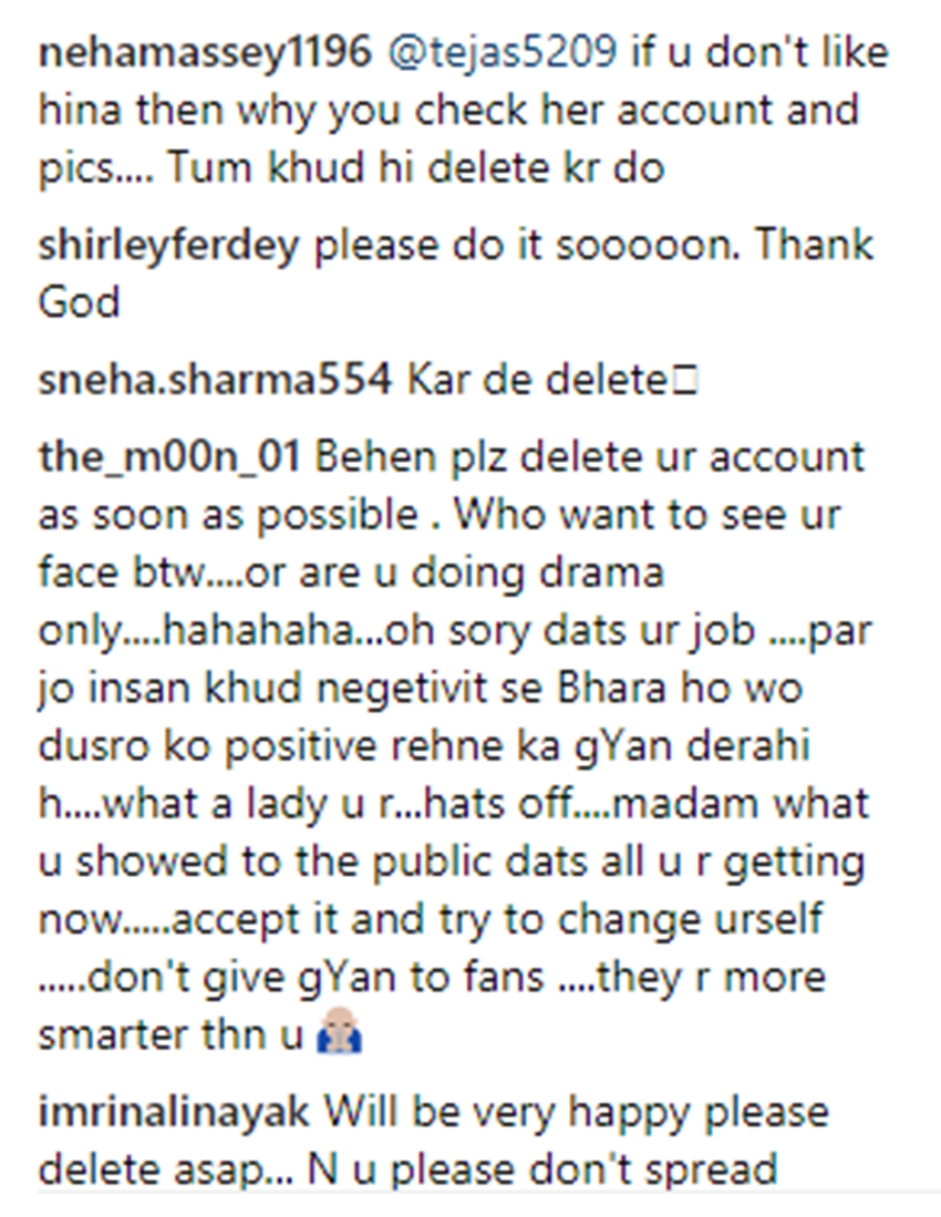 अपने लाइव में हिना कहती हैं, ‘मैं आप लोगों से बहुत प्यार करती हूं, आप लोग मुझे ऐसे ही प्यार देते रहें। फॉलो करते रहें, मुझे आपकी दुआओं की जरूरत है। आपके आशीर्वाद की जरूरत है। किसी भी बुरी चीज का रिस्पॉन्स न दें। निगेटिव चीजों को अवॉइड कीजिए। नहीं तो मैं सीरियस्ली कह रही हूं, मैं अपना अकाउंट डिलीट कर दूंगी। मेरा भरोसा नहीं है मैं ऐसा भी कर सकती हूं। प्यार फैलाएं.. बाय’