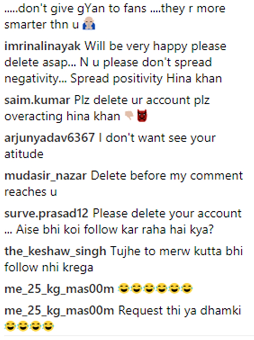 सोशल मीडिया पर इस वीडियो के सामने आने के बाद लोगों ने हिना खान को ट्रोल करना शुरू कर दिया। हिना खान के इस वीडियो के जवाब में यूजर्स ने लिखा, थैंक्यू हिना खान जल्दी ट्विटर अकाउंट बंद करो। दूसरे यूजर ने लिखा, ‘बहन प्लीज अपना अकाउंट डिलीट कर दो, जितनी जल्दी हो सके। वैसे भी कौन तुम्हारा चेहरा देखना चाहता है। तुम हमेशा ड्रामा करती रहती हो। ओह सॉरी ये तो तुम्हारा जॉब है। लेकिन जो इंसान खुद निगेटिविटी से भरा हो, वो दूसरों को पॉजिटिव होने का ज्ञान दे रही है। क्या लेडी हो तुम? मैडम जो आप हो और पब्लिक को दिखाती हो, आपको बदले में वही मिल रहा है। इसे एक्सेप्ट करो और इसे बदलने की कोशिश करो। फैंस को ज्ञान मत दो, वो तुमसे ज्यादा स्मार्ट हैं।’