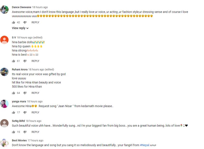 हिना खान ने इस वीडियो को अपने यूट्यूब चैनल पर फैंस के साथ शेयर किया है। हिना के चैनल को खुले अभी ज्यादा वक्त नहीं हुआ है। अब तक एक्ट्रेस के चैनल के 56,114 सब्सक्राइबर्स ही हैं। हिना के फैंस इस वीडियो को देख कहते दिख रहे हैं- ‘यह तो हमारे लिए सरप्राइज है, कमाल है एक्टिंग भी और गाना भी।’ किसी ने कहा- ‘ऑसम मुझे भाषा बेशक समझ नहीं आ रही, लेकिन आपकी अवाज, आपका फैशन, आपका स्टाइल, आपका ड्रेसिंग सेंस कमाल है। आई लव यू’।
