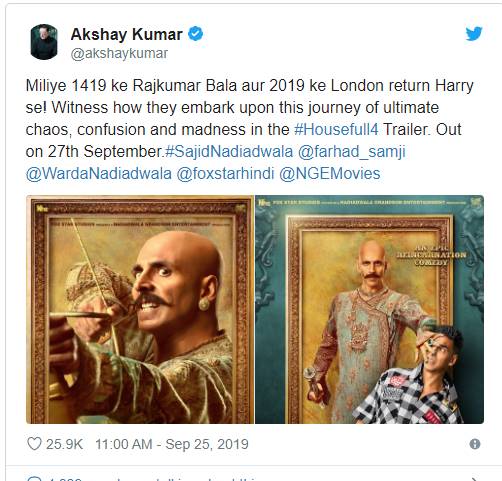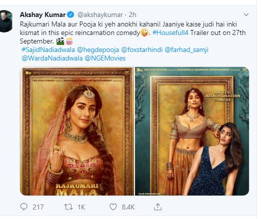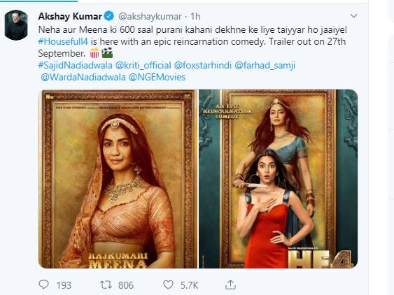 उन्होंने अपनी पोस्टर शेयर कर लिखा था, ”कहानी की थी बाला ने 1419 में, मगर खत्म हैरी करेगा 2019 में। इस पागलपन के लिए तैयार हैं… ‘हाउसफुल 4’ का ट्रेलर 27 सितंबर को रिलीज होगा।”बता दें कि इस फिल्म के जरिए अक्षय एक बार फिर से पूजा हेगड़े संग नजर आ रहे हैं। इससे पहले दोनों रुस्तम में साथ दिखाई दिए थे। दोनों के अभिनय को काफी सराहा गया था।