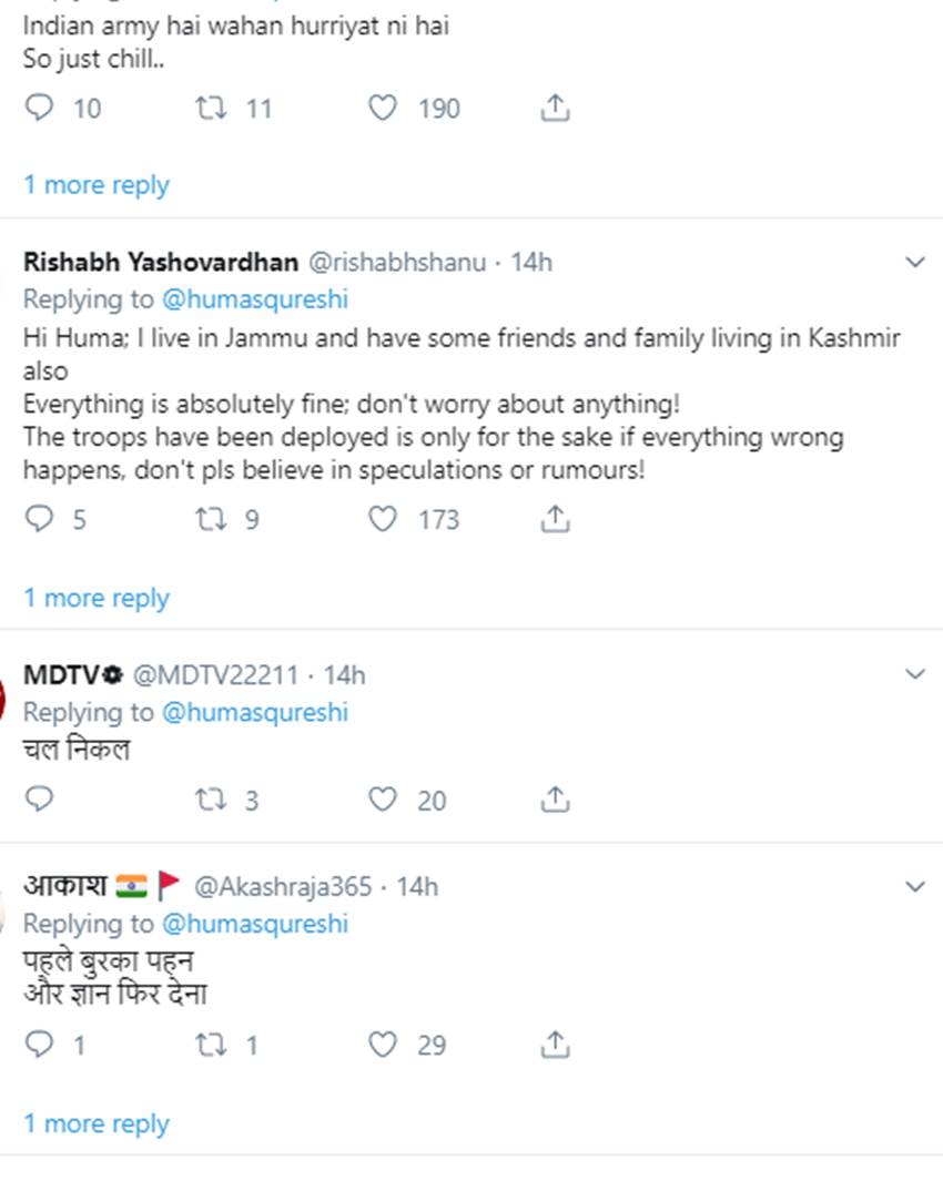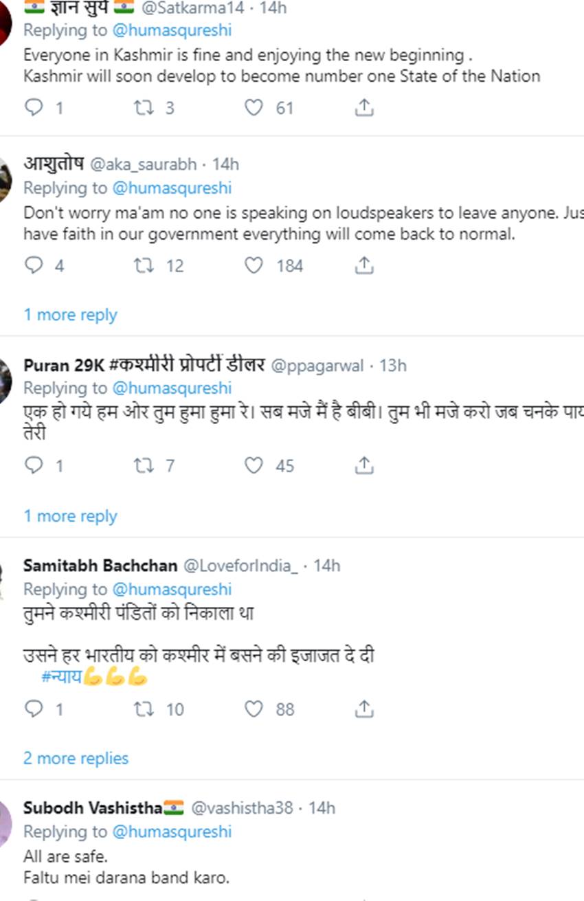 एक अन्य यूजर लिखता- सब मजे में है बीबी, तुम भी मजे करो। एक यूजर हुमा के सवाल का जवाब देते हुए कहता कि – ‘चिंता न करें। मैं जम्मू में रहता हूं। कश्मीर में मेरी फैमिली और कुछ दोस्त भी रहते हैं। सब ठीक है वहां। चिंता की कोई बात नहीं।’