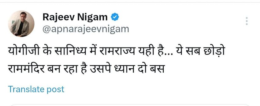 जाने-माने कॉमेडियन राजीव निगम सोशल मीडिया पर काफी एक्टिव करते हैं। वह लगभग हर मुद्दे पर अपनी राय रखते नजर आते हैं। अब हाल ही में कॉमेडियन ने एक न्यूज बेवसाइट के आर्टिकल को शेयर करते हुए लिखा कि “योगीजी के सानिध्य में रामराज्य यही है… ये सब छोड़ो राम मंदिर बन रहा है उसपे ध्यान दो बस।” कॉमेडियन का यह ट्वीट सोशल मीडिया पर काफी वायरल हो रहा है। सोशल मीडिया यूजर्स कॉमेडियन के ट्वीट पर अपनी प्रतिक्रियाएं देते नजर आ रहे हैं।