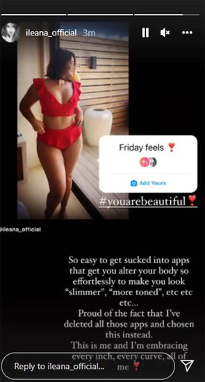 इलियाना की ये तस्वीर बिना किसी फिल्टर के है। उन्होंने खुद को स्लिम या टोन्ड दिखाने के लिए किसी ऐप का यूज नहीं किया है। उन्होंने पहली बार अपनी ऐसी फोटो शेयर की है और पहली बार इस पर बात की है। उन्होंने बताया कि एडिट करने वाले सारे ऐप उन्होंने डिलीट कर दिए हैं और वो अपने इस शेप को स्वीकार करते हुए बहुत खुश हैं।