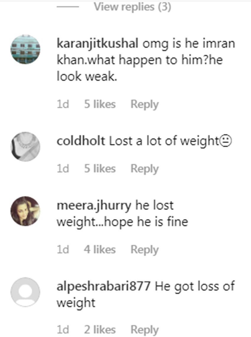 बुधवार को इमरान जिम के बाहर स्पॉट किये गए। तस्वीरों में एक्टर व्हाइट टी-शर्ट और लॉग शॉट्स में नजर आ रहे हैं। इसके अलावा उन्होंने कैप भी पहनी हुई है। मुस्कुराते हुए इमरान खान काफी कमजोर और थके हुए नजर आ रहे हैं। इन तस्वीरों को देखकर इमरान खान के फैन्स उनकी सेहत के प्रति चिंता जता रहे हैं। एक इंस्टाग्राम यूजर लिखते हैं- उम्मीद करता हूं कि सब ठीक है, यह काफी परेशान लग रहे हैं। वहीं एक अन्य यूजर लिखते हैं- हे भगवान ये इमरान खान हैं, क्या हुआ है इसके साथ? यह बहुत कमजोर लग रहे हैं। वहीं एक यूजर लिखते हैं- इनका काफी वजन कम हो गया है, उम्मीद करता हूं कि यह ठीक हैं।