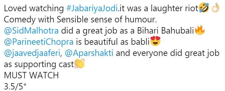 सोशल मीडिया पर फैन्स फिल्म को देखने के बाद अपना रिव्यू दे रहे हैं। एक यूजर ने लिखा-जबरिया जोड़ी को देखकर अच्छा लगा। फिल्म में कॉमेडी और हंसी का तड़का है। सिद्धार्थ बिहारी बाहुबली के रूप में शानदार काम किया है। परिणीति बबली लग रही हैं। फिल्म को पांच में से 3.5 स्टार्स दिए हैं।