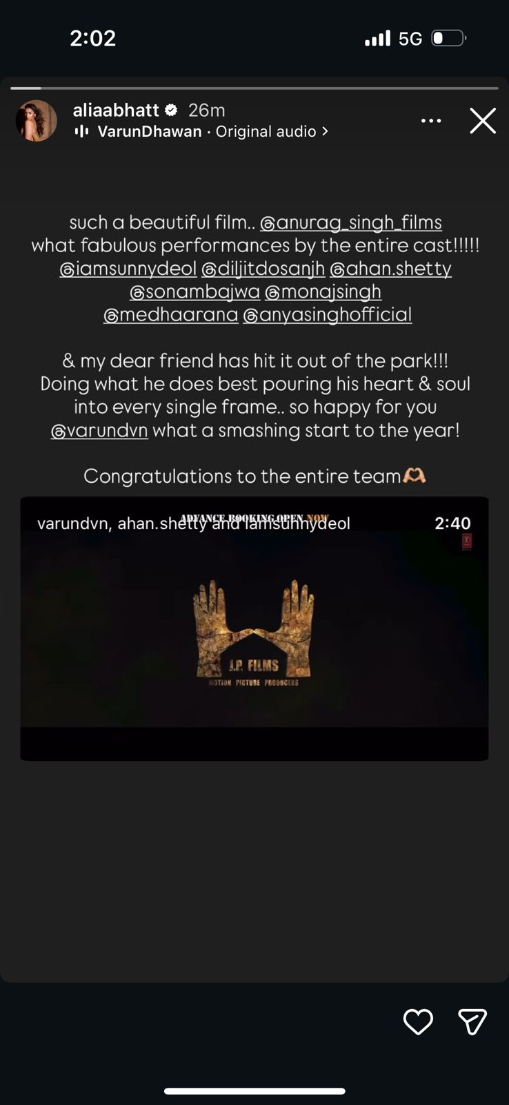 अपने दोस्त और को-एक्टर वरुण धवन के लिए आलिया भट्ट ने भी खास नोट लिखा है। उन्होंने इंस्टाग्राम स्टोरी पर ‘बॉर्डर 2’ को लेकर लिखा, “इतनी खूबसूरत फिल्म… @anurag_singh_films पूरी कास्ट ने कमाल का परफॉर्मेंस दिया है!!!!! @iamsunnydeol @diljitdosanjh @ahan.shetty @sonambajwa @monasingh @medhaarana।”