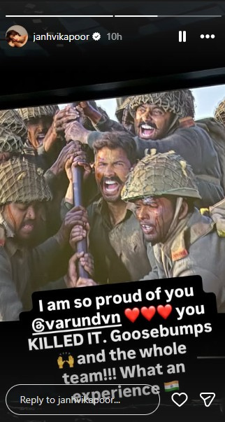 सिनेमाघर के अंदर से एक तस्वीर शेयर करते हुए जान्हवी ने बताया कि फिल्म का अनुभव उनके लिए बेहद खास रहा, खासतौर पर वरुण धवन का अभिनय उन्हें गहराई से प्रभावित कर गया। अपनी पोस्ट के कैप्शन में जान्हवी कपूर ने वरुण धवन और फिल्म की पूरी टीम को बधाई देते हुए लिखा, “मुझे तुम पर बहुत गर्व है वरुण धवन। तुमने कमाल कर दिया। रोंगटे खड़े हो गए। और पूरी टीम—क्या जबरदस्त अनुभव रहा!”