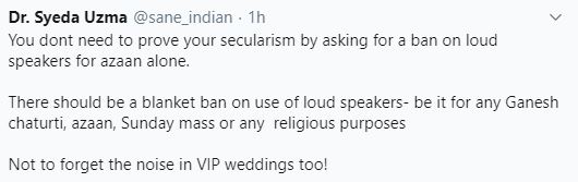 डॉ. सैयद उज़्मा नाम के यूजर ने लिखा, ‘आपको अपना सेक्युलरिज्म साबित करने के लिए सिर्फ अजान के दौरान लाउडस्पीकर बैन करने की मांग नहीं करनी चाहिए। लाउडस्पीकर पर पूरी तरह प्रतिबंध लगना चाहिए, फिर चाहे गणेश चतुर्थी हो, अजान हो या संडे मास…। वीआईपी शादियों में शोरगुल को भी मत भूलिए’। एक अन्य यूजर ने लिखा, ‘यह क्या कह दिया साहब, सोनू निगम के साथ क्या हुआ… याद है ना आपको’।