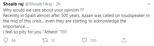 इस ट्वीट के बाद ट्विटर पर जावेद अख्तर ट्रोल्स के निशाने पर आ गए। शोएब राज नाम के एक यूजर ने लिखा ‘हम आपके विचारों की परवाह ही क्यों करें? हाल ही में स्पेन में 500 साल के बाद लाउडस्पीकर पर अज़ान हुई। यहां तक कि अब उनको भी इसका महत्व समझ में आने लगा है। मुझे आपपर दया आती है नास्तिक महोदय…’। देवेंद्र नाम के एक यूजर ने लिखा ‘थोड़ा इंतजार करिए, फतवा आता ही होगा आपके खिलाफ। राज नाम के यूजर ने लिखा ‘मियां, जन्नत जाने का रास्ता बंद करवा रहे हो…’।