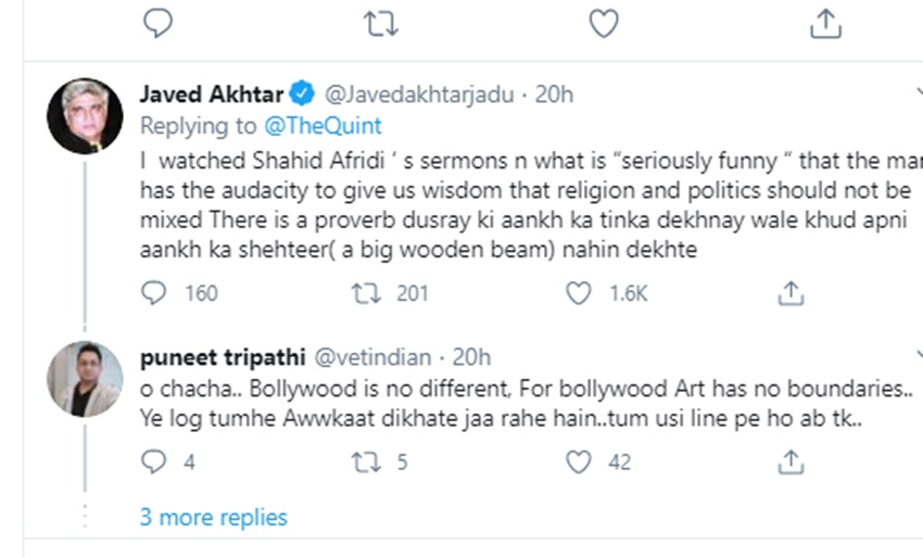 कुछ लोगों ने जावेद की बात पर सहमती जताते हुए कहा- सर आपने एक दम सही कहा। तो किसी ने कहा- ‘सर लगता है आपको आइना देखे काफी समय हो गया है।’ बता दें, शाहिद अफरीदी के बयान पर इंडियन क्रिकेटर हरभजन सिंह, युवराज और शिखर धवन जैसे खिलाड़ियों ने भी रिएक्शन दिया। शाहिद अफरीदी के शब्दों पर गुस्सा जाहिर करते हुए हरभजन ने कहा कि वह शाहिद से अपना दोस्ती का नाता तोड़ रहे हैं। तो वहीं युवराज ने भी कहा कि- शाहिद अफरीदी के इस तरह के शब्दों को जरा भी बर्दाश्त नहीं किया जाएगा।