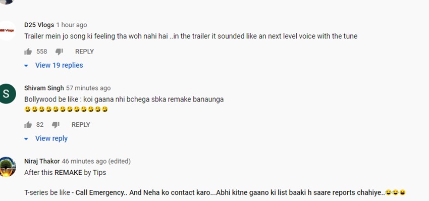 किसी ने लिखा- सॉन्गकी सारी फीलिंग मारदी। तो किसी ने कहा- इस वक्त, बॉलीवुड ऐसा हो रखा है जैसे-कोई गाना नहीं बचेगा, सबका रिमेक बनाऊंगा। तो एक यूजर ने चुटकी लेते हुए कहा- नेहा कक्कड़ को तुरंत फोन लगाओ, पूछा रिपोर्ट लो अभी कितने और गाने बाकी हैं।