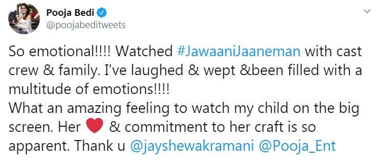 अलाया की एक्टिंग के बारे में पूजा ने ट्वीट कर अपने दिल की बात भी कही। उन्होंने लिखा बहुत ही भावुक। कलाकारों और परिवार के साथ जवानी जानेमन देखी। मैं हंसी, रोयी और भावनाओं से भर गई थी। मेरी बच्ची को बड़े पर्दे पर देखने का क्या अद्भुत अहसास है। थैंक यू।