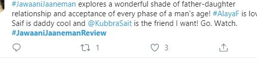 एक फैन फिल्म जवानी जानेमन देख बोली ये फिल्म पिता और बेटी के रिलेशनशिप को खूबसूरती से दर्शाती है। वहीं फिल्म ये भी दिखाती है कि एक आदमी और उसकी एक किस हिसाबसे बदलती है। फिल्म में रिश्तों को वैसे ही कबूलने औऱ प्यार करने की अहमियत दर्शाता है।