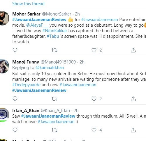 फिल्म जवानी जानेमन में सैफ अली खान के यंग लुकको काफी पसंद किया जा रहा है। फैंस फिल्म को लेकर कह रहेहैं कि ये फिल्म प्योर एंटरटेनमेंट है। आलिया की खूब तारीफें हो रही हैं। लोग कह रहे हैं कि आलिया का काम शानदार है। सैफ अली खान ने भी आलिया की तारीफ कर कहा था कि लग ही नहीं रहाकि आलिया पहली बार स्क्रीन पर आ रही हैं।