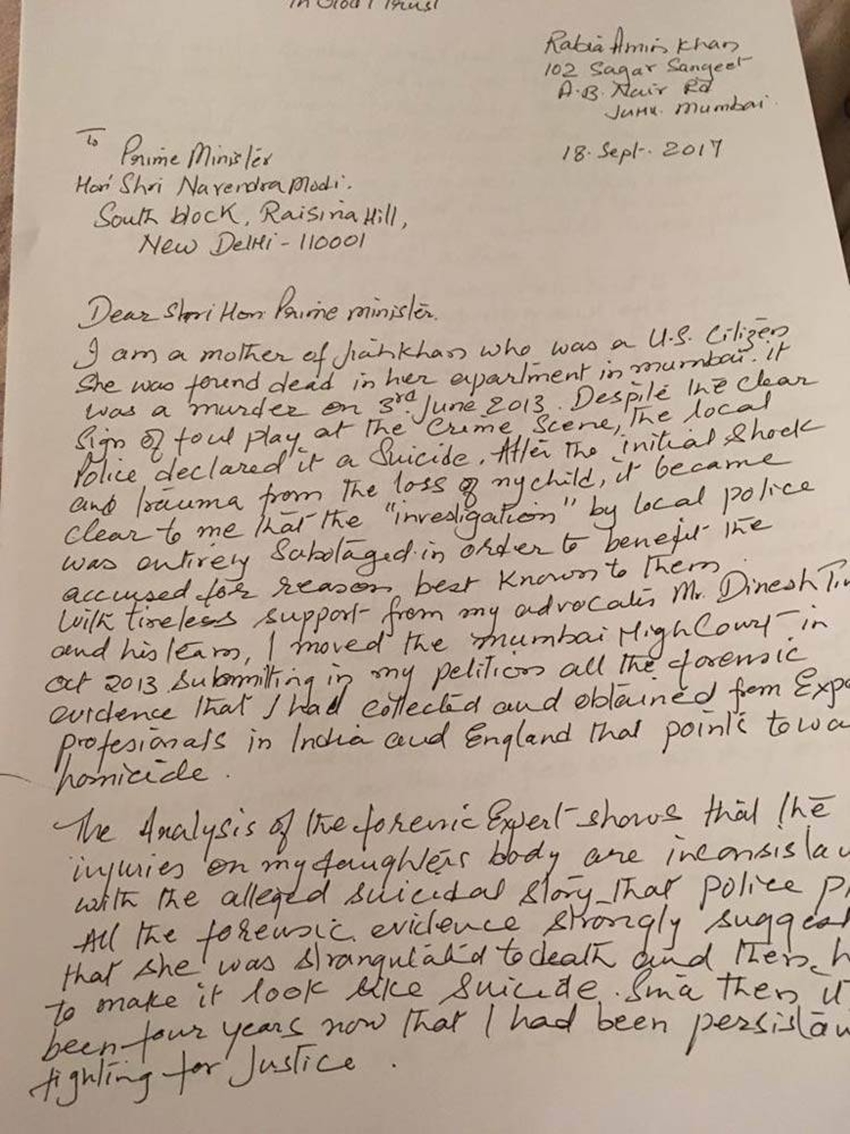 बॉलीवुड एक्ट्रेस जिया खान की मां राबिया खान ने भारत के प्रधानमंत्री नरेंद्र मोदी को खत लिखकर उसने न्याय दिलाने की गुहार लगाई है। उनका आरोप है कि हत्या के मामले को पुलिस ने आत्महत्या का बना दिया है। उनका दावा है कि 3 जून 2013 को फ्लैट में जिया की हत्या की गई थी। फ्लैट में एक्ट्रेस मृत मिली थीं। 18 सितंबर को लिखी चिट्ठी में राबिया ने एक्ट्रेस को अमेरिका का नागरिक बताया था। अभी तक इस मामले में यह पता नहीं चल सका है कि नि:शब्द स्टार की हत्या हुई थी या उन्होंने आत्महत्या की थी। राबिया पहले भी पीएम से अपनी बेटी की मौत को लेकर जांच करवाने की अपील कर चुकी हैं।